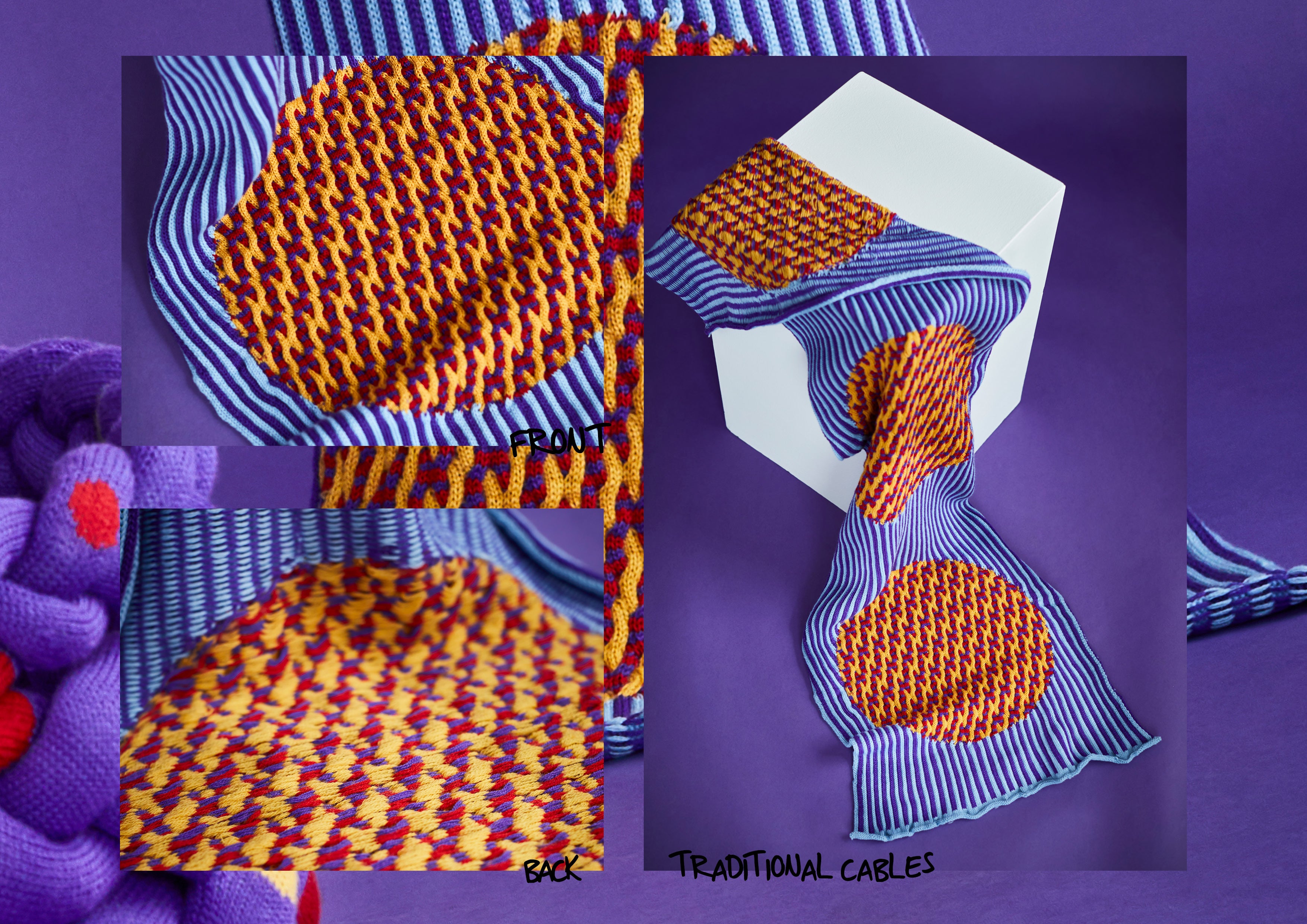 Next step was crocheting and when I was 15 I was really into crocheting portraits. After that I got into knitting, so knitting is actually the thing I've been doing for the shortest time but also the thing I'm doing the most now. I always wanted to become a fashion designer (thanks to project runway) so after high school I decided to study textiles at Önnestads folk high school. There I learned the basics in sewing, pattern making, weaving, screen printing, etc. After 1 year I decided to also study 1 year of art at the same school (because I didn't know what I wanted to do). I always thought I would do fashion design but I realised that the thing I love about clothes are how the patterns and textiles make the garment so instead I decided to study textile design. I got a bachelors degree in textile design at the swedish school of textiles and graduated in 2021. For my degreework I explored cable knitting in combination with colourwork techniques because that's a combination that haven't really been explored that much. Cable knitting is traditionally in 1 colour and colourwork is usually flat so I wanted to see how the mix of patterns and texture could create something new. I fell in love with the techniques and kept exploring it after I graduated which eventually led to me starting Klarybarry.
