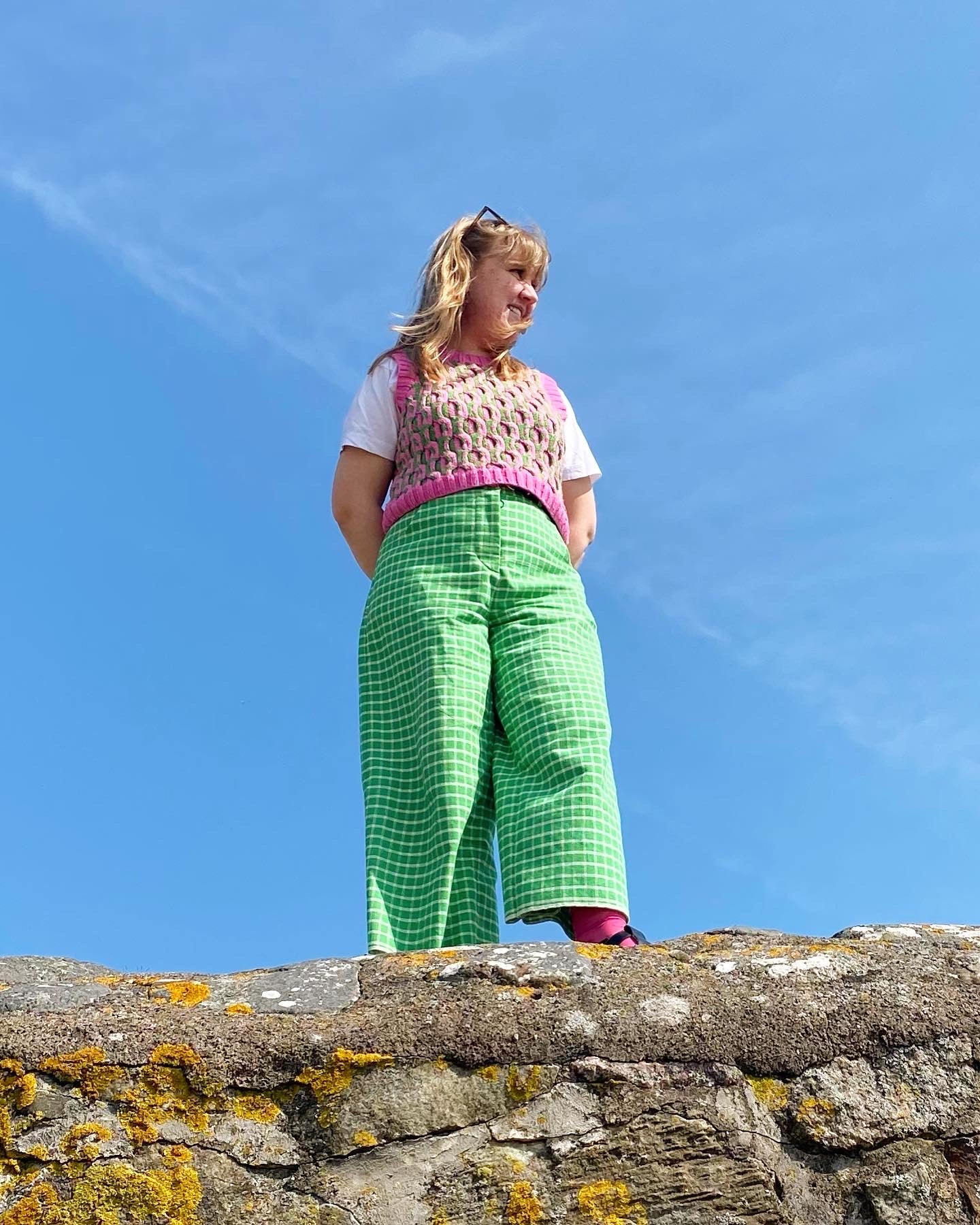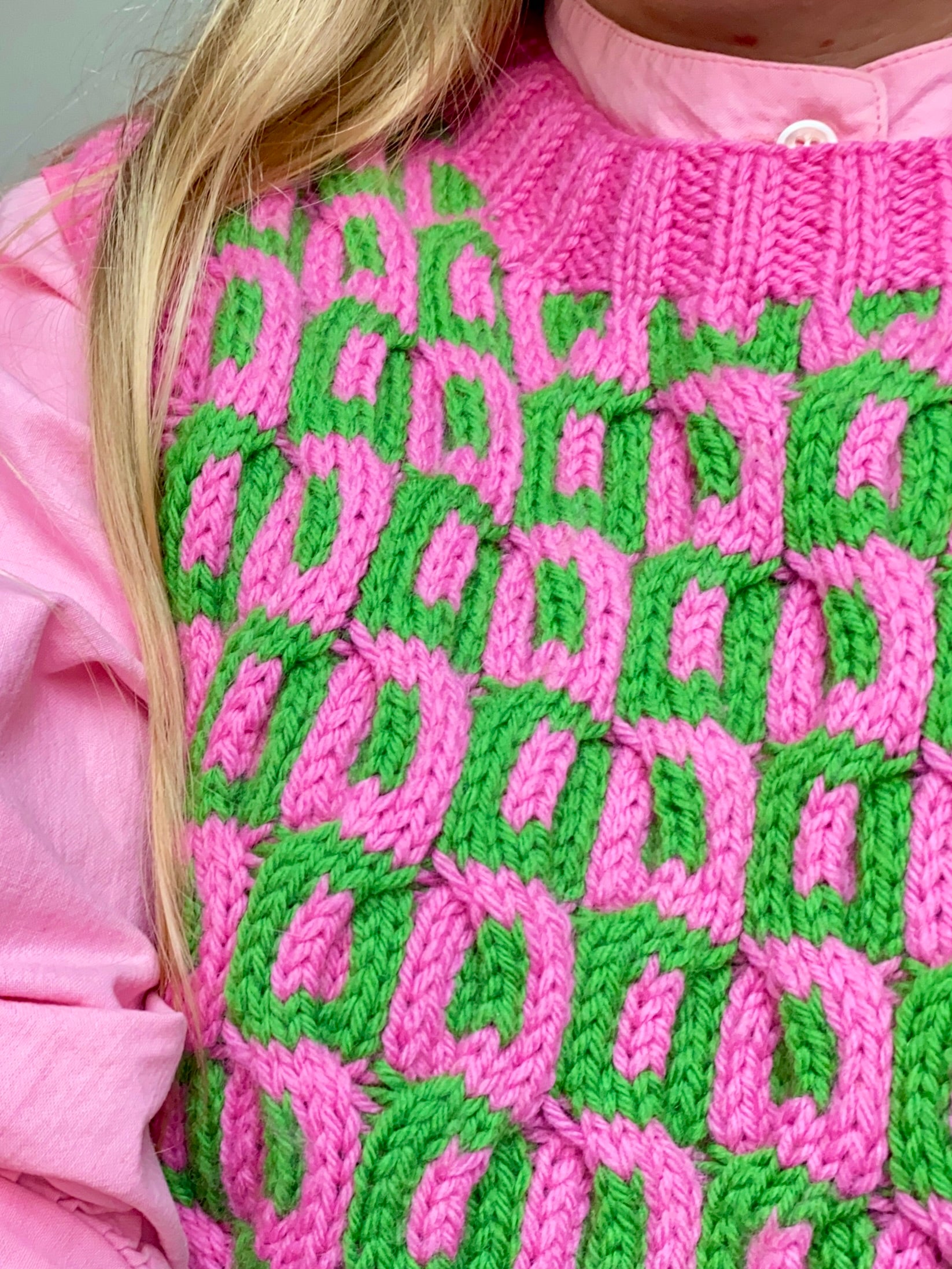 The outside the box vest is based on the "Jacquard pullover" I designed for pom pom magazine spring 2023. The jacquard pullover is knitted in a 2-coloured cable pattern using stranded knitting. The jacquard pullover was knitted on 2.5 mm needles which can be a bit intimidating, especially with an all over multicolored cable pattern. The solution? A chunky vest using the same pattern.