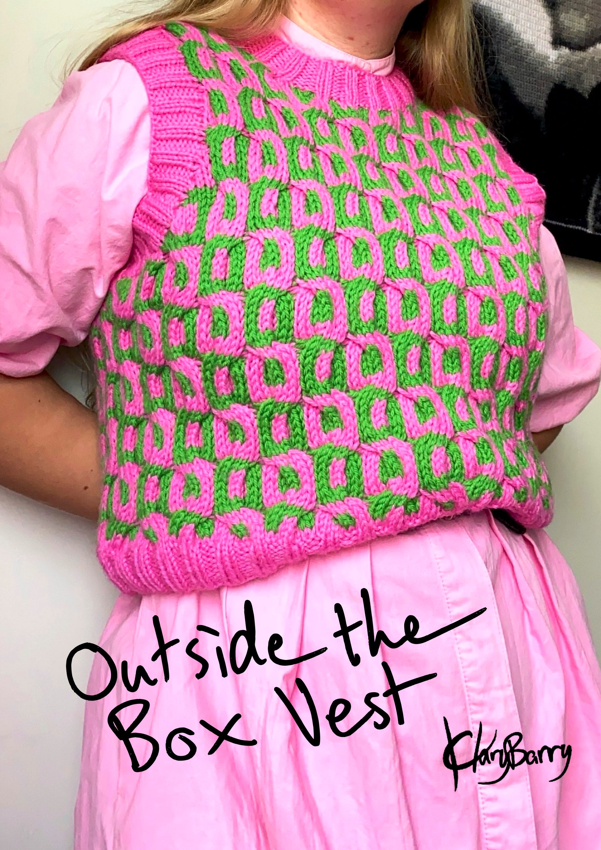 The outside the box vest is knitted bottom up in the round up to the armholes, where the work is divided into front and back and knitted back and forth. The shoulders are sewn together and then a ribbed edge is knitted around the neckline and the armholes.