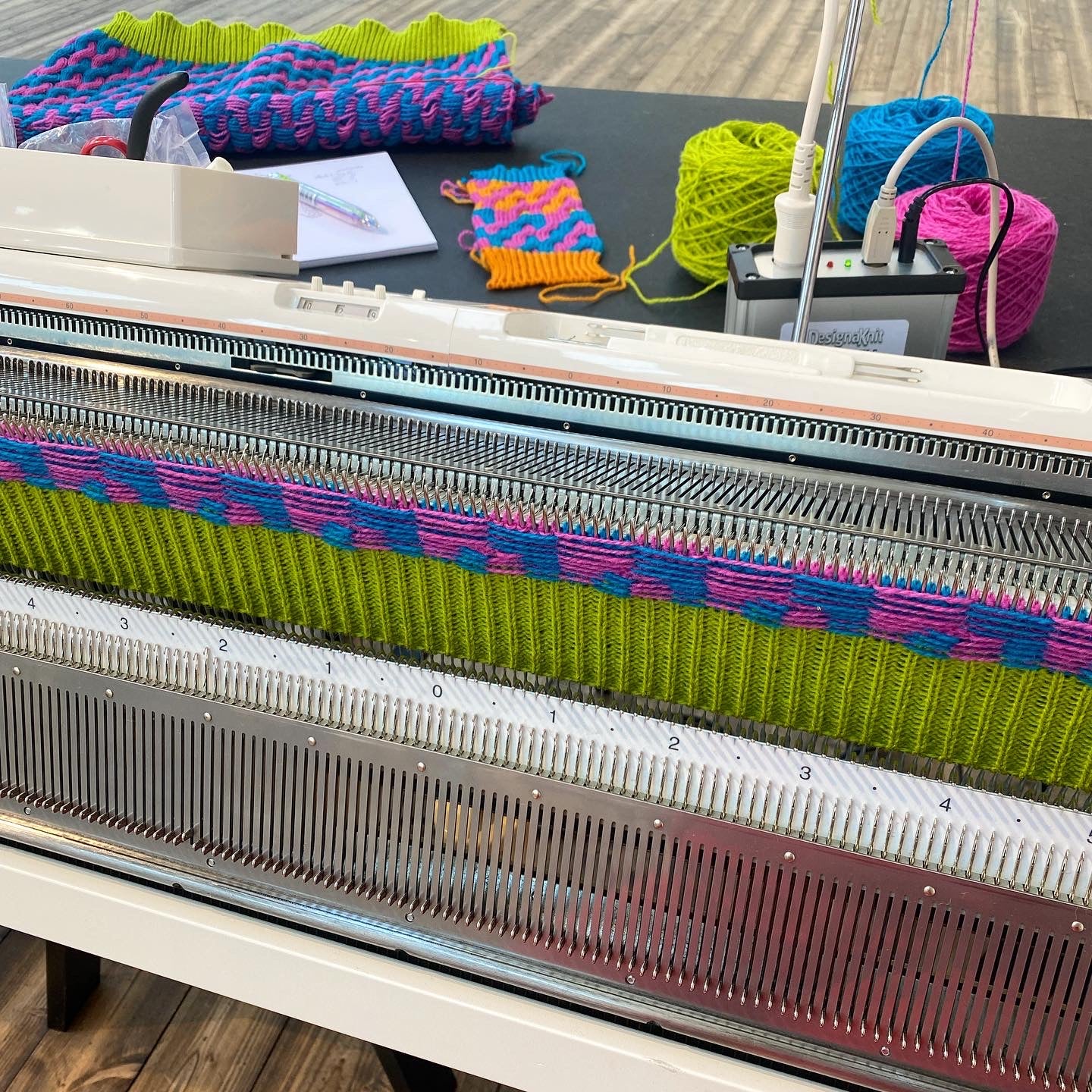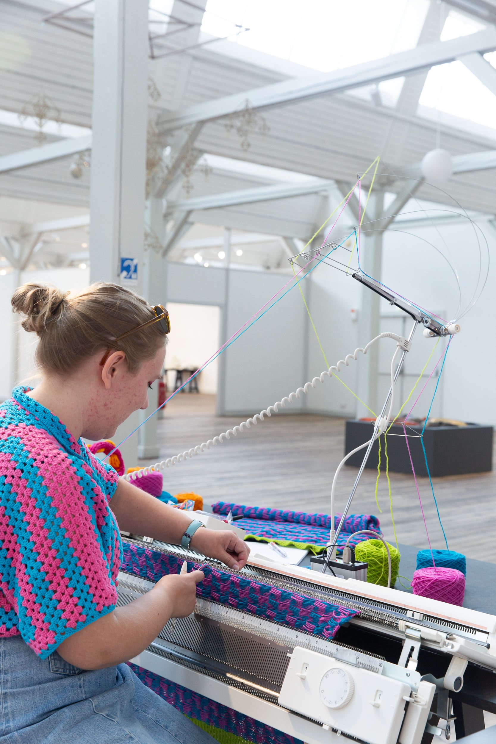 My goal with the residency was to show the process of making a garment. In today's fast fashion world we have become distanced to the production of our clothes and forget that our garments are made by people, not machines (even if it's knitted on a domestic knitting machine it's still hand made. All cables (where the stitches twist around each other) has to be moved manually. The only thing the machine does is knit the right color at the right place (which I have programmed) and knit the stitches when I pull the carriage.