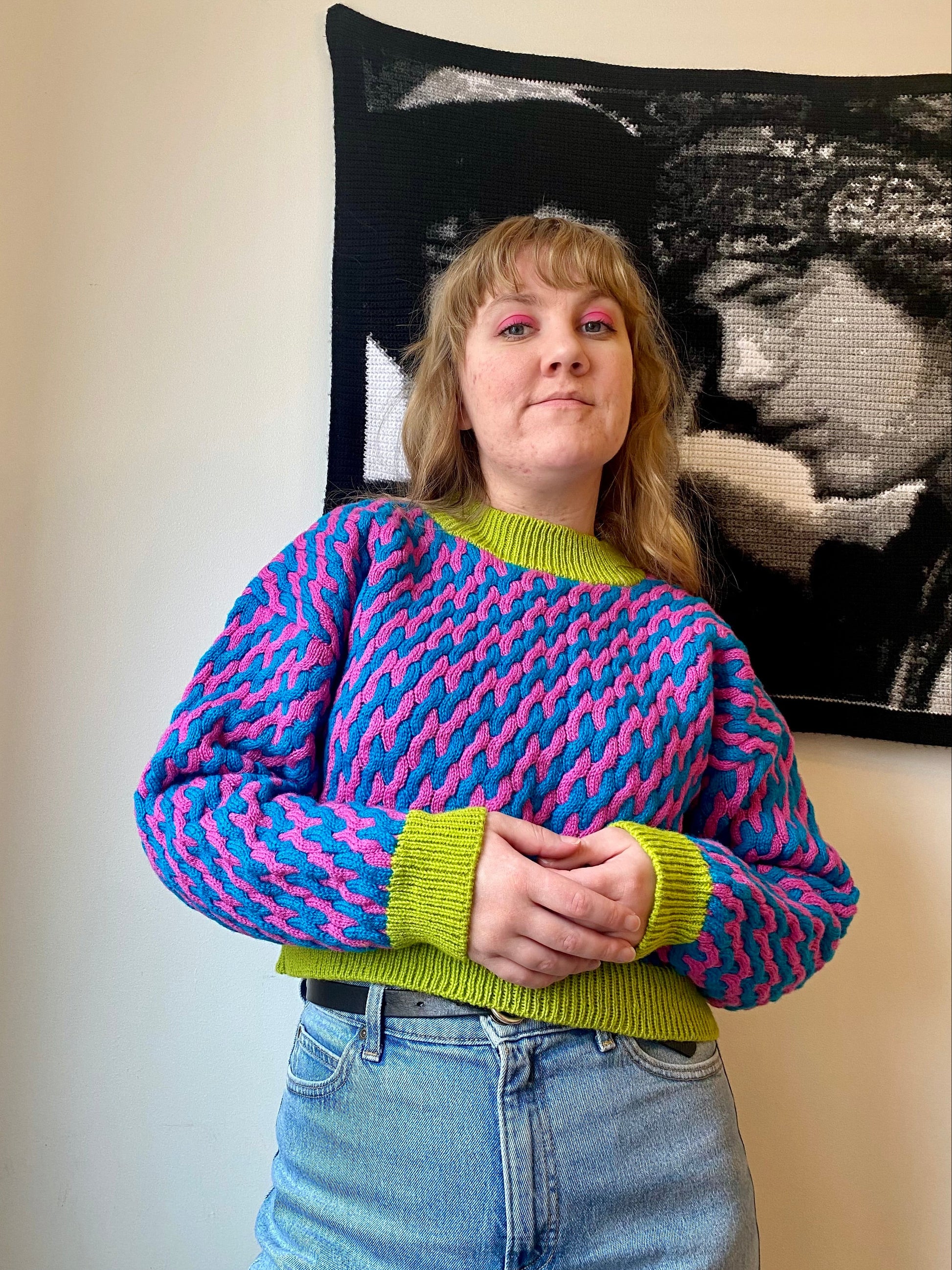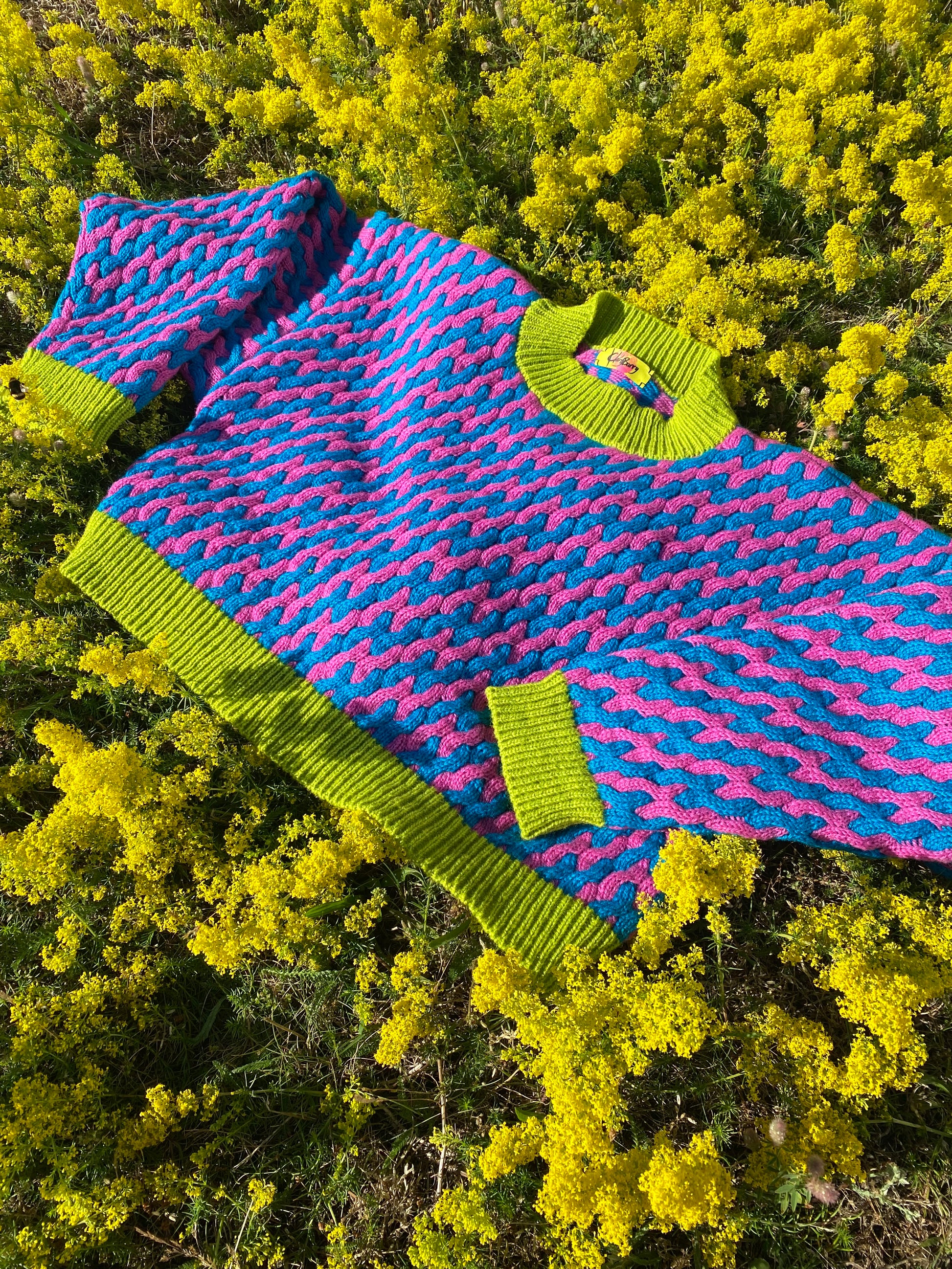 This Twister sweater was knitted on a domestic knitting machine during an artist-in-residence I was part of during the summer of 2024. The residency lasted for 5 days (around 25 h) which was just enough time to finish the sweater (except for weaving in all the ends).