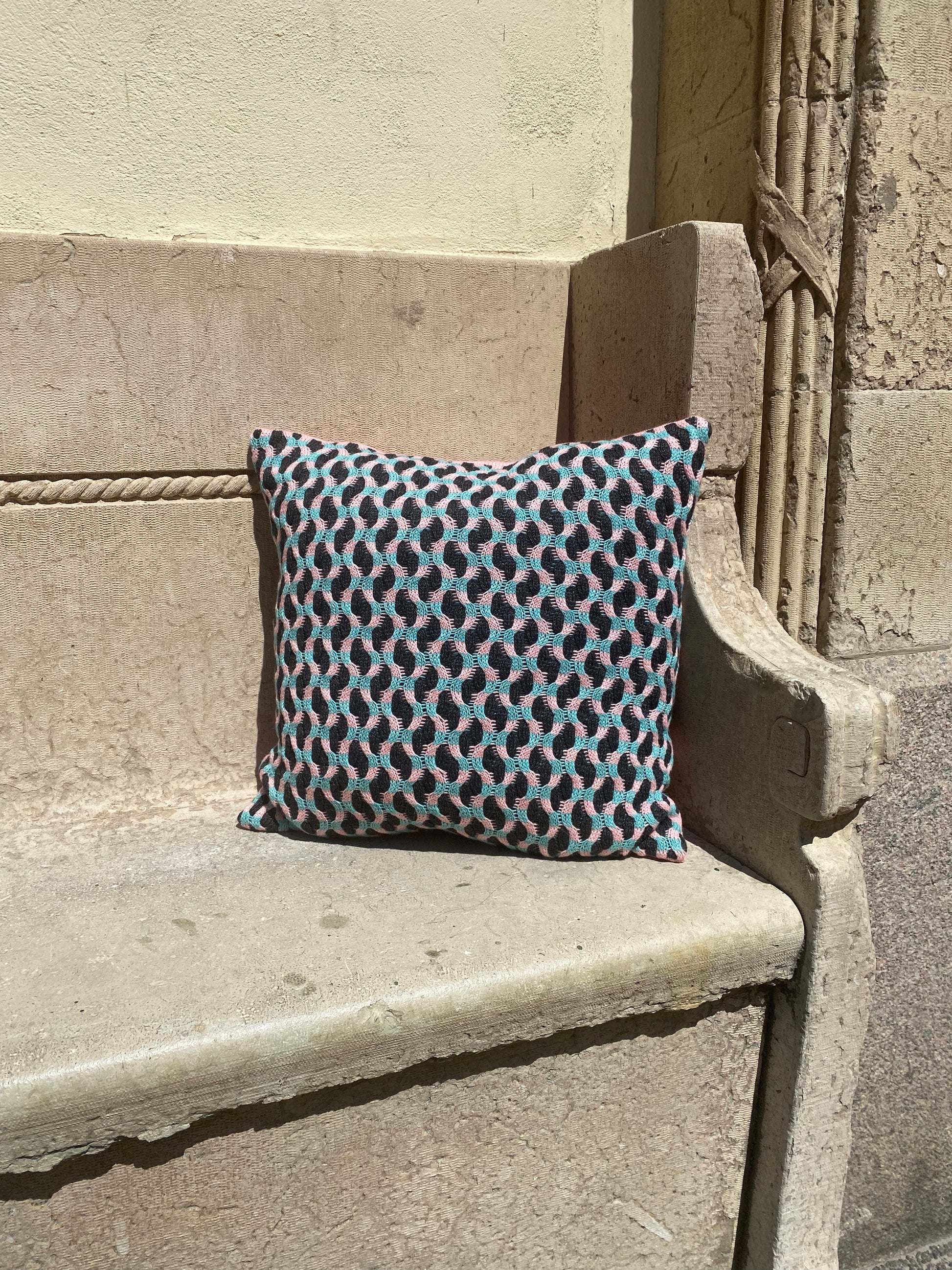Bring a pop of playful color to your home with the Sour Worm Cushion Cover. Made in pink, blue, and dark grey deadstock yarn (think sour worms meets salty licorice).